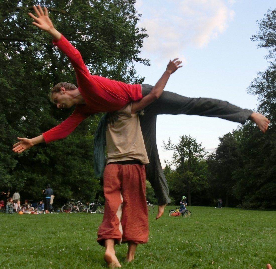 Contact Improvisation ist eine Tanzform, in der sich zwei oder mehr Tänzer einander an beliebigen Stellen des Körpers berühren und dabei lehnen und Gewicht teilen können. Zu den Grundprinzipien zählen die aufmerksame Wahrnehmung des eigenen Körpers und der Umgebung, der achtsame Kontakt im Miteinander und die Integration der physikalischen Kräfte. Das Erforschen von Flieh- und Schwerkräften in der Bewegung eröffnet eine Vielfalt und Dynamik im Tanz: Balance, Fallen, Rollen, Gleiten, Heben, am Boden oder in der Luft. Jede Bewegung entsteht unmittelbar aus der vorangegangenen – improvisiert und orientiert am gemeinsamen Kontaktpunkt. Es gibt weder Schrittfolgen, noch feste Rollen zwischen den Tanzenden. Die Fragen, ob, wo und wieviel berührt wird, wann genau der Tanz beginnt und wann er endet, bleiben immer ein Stück weit offen und werden in actu miteinander ausgehandelt. Gerade dieser Mangel an Festlegungen fordert eine ständige Wachheit für den Moment. Wo – innerhalb eines vereinbarten Rahmens – nichts klar ist, braucht es meine ständige Aufmerksamkeit, um mich zu verorten, zu beziehen und reagieren zu können. In der Contact Improvisation begegne ich anderen Tänzern jenseits der Worte und doch ist es ein Gespräch, in dem wir uns austauschen, etwas voneinander erfahren, Einvernehmen möglich ist und Missverstehen, Aneinander vorbeireden wie auch gelungener Austausch. Klarheit für den Beginn des Tanzes schafft eine Berührung, ein beliebiger Teil meines Körpers berührt irgendeinen anderen meiner Tanzpartnerin und in diesem Moment fordert der Kontaktpunkt alle Aufmerksamkeit: Was erfahre ich von ihr, von ihrer Körperspannung, ihrer Struktur und ihrer Bewegungsrichtung? Was sende ich aus? Die Berührung reicht durch viele Schichten: die Haare an der Hautoberfläche geben erste Signale, die Haut vermittelt Haften oder Gleiten, Klarheit oder Unschlüssigkeit, Wärme und Weichheit, das Bindegewebe und die Muskeln vermitteln Spannung und Intention, Offenheit und Bereitschaft, die Knochen schließlich geben Auskunft über die Passung der Körper an dieser Stelle: Welche Strukturen kommen hier in Kontakt, wieviel Kraft kann hier übertragen werden, welche Bewegungsentwicklungen sind wahrscheinlicher, sind anatomisch möglich? In dieser körperlichen Begegnung offenbart sich mein Zustand ungefiltert, meine Anspannungen werden spürbar und meine Zurückhaltung ebenso wie meine Bereitschaft mich einzulassen. Ich werde für die Andere spürbar. Und das genau so, wie ich gerade in dieser Begegnung bin. Am Du werde ich zum Ich [1] (Martin Buber). In der Beziehung offenbart sich für uns beide, wer wir jetzt jeweilig sind. Die Begegnung zwingt mich anwesend zu sein und zwar als Berührender und als Berührter. „Vom Anderen berührt werden heißt daher, in einer elementaren Weise von ihm erkannt zu sein und sich selbst zu erkennen. Im »Kontakt« mit dem Anderen werden wir einander nicht nur im körperlichen, sondern im personalen Sinn wirklich.“ [2] Ich nehme von meiner Partnerin vielfältige Informationen auf, ich könnte versuchen, sie einzeln zu benennen und doch ist vorher schon ein Bild in Gänze da: das von ihrer Leiblichkeit zu dem mein Leib in Resonanz geht. Mein Leib zeigt sich empathisch für den anderen Menschen und seiner Körperlichkeit, schwingt ein und erlaubt ein unmittelbares Verständnis von der körperlichen Beschaffenheit, der anatomischen Struktur und auch wie der Körper gestimmt ist. Ich spüre meine Tanzpartnerin am eigenen Leib. Wir sind verflochten in einem „wechselseitigen leiblichen Spüren und Umbilden“, schwingen in einer „ zwischenleiblichen Resonanz “. [3] Es bildet sich ein labiles Gleichgewicht, in dem sich die Körperspannungen annähern, die Nähe bestimmt ist, die Aufmerksamkeit fokussiert – und doch ist es kein Verharren, sondern ein Spüren, ein Lauschen auf das was passiert. Bleibt es bebende Stille oder ist schon der nächste Moment voller Bewegung? In dem Punkt der Berührung kulminiert die Wahrnehmung, doch geht die Beeinflussung durch alle Zellen: alle Gelenke zwischen Boden und Partnerin ermöglichen den Kontakt und fragen schon nach der weiteren Entwicklung, die abgewandte Körperseite bildet die Balance, jede Muskelfaser nimmt die Spannung oder Entspannung an, die vom Kontakt ausgeht. Und so geschieht die Improvisation, die nichts anderes ist als Spontaneität: das Fließen lassen im Wirkungsfeld des anderen Leibes. Vordergründig bestimmen physikalische Kräfte den Tanz: eine leichte Regung, schon ändert sich der Schwerpunkt, ich korrigiere meine Haltung, und so auch meine Tanzpartnerin. Und so flieht der Schwerpunkt weiter und jede Bewegung fordert eine Anpassung, eine neue Bewegung und das Spiel ist, ob im Kleinen oder Großen, sofort im Gange. Je länger dieses Spiel geht und je mehr wir uns darauf einlassen, desto mehr dehnen sich unsere Körperschemata aufeinander aus. Wie bei meinem eigenen Körper habe ich durch die Berührung und Bewegung eine Vorstellung des Schemas meiner Partnerin. Auch wenn ich sie nicht sehe, habe ich stets eine Ahnung wo und wie ihr Körper im Raum und zu mir steht und sich bewegt. Diese Ahnung ist unmittelbar leiblich abrufbar. So wie ich meinen Körper unvermittelt erlebe, erlebe ich ihren Körper in der Bewegung gleichsam mit. Dies wird insbesondere beim Fehlgehen der Ahnung anschaulich: Wenn dort Leere ist, statt des erwarteten Arms, oder wenn am Ende einer streichenden Bewegung nicht der Torso, sondern die Hand spürbar wird, bin ich irritiert. Meine Aufmerksamkeit geht aus dem Spüren in das Denken, aus der verleiblichten Wahrnehmung in die Kognition und ihr Körper fällt aus meinem Spürbewusstsein heraus – bis durch neue Orientierung und Gewöhnung ihr Schema wieder integriert wird und die Wahrnehmung ihres Körpers wieder in die Tiefe meines leiblichen Verstehens sinken kann. Je mehr dieses Vertrautsein der Körper wächst, desto mehr wird es ein leibliches Vertrautsein. Me